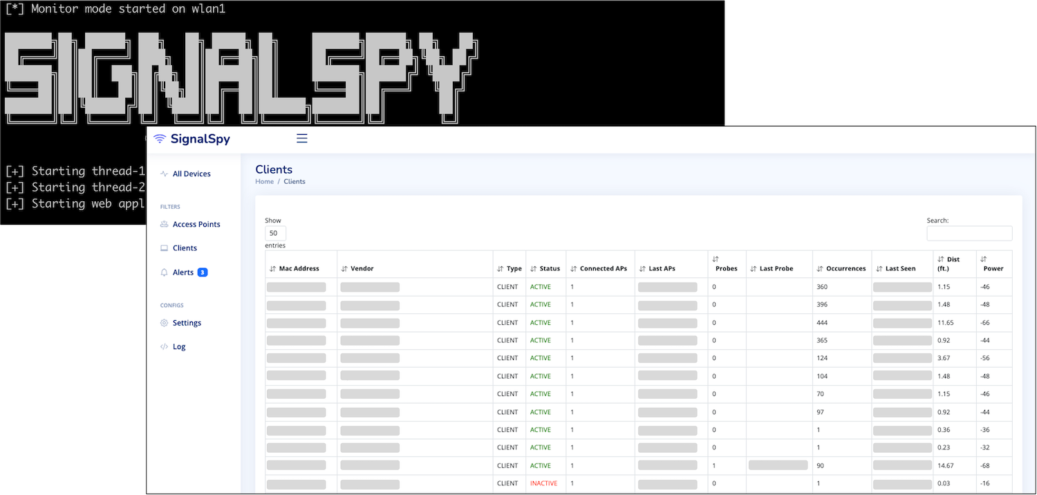 SignalSpy uses the aircrack-ng suite to monitor nearby devices and display the data in a neatly formatted web application. This information can be used to track signals in range, view connected devices of neighboring access points, and calculate approximate distance based on signal strength.