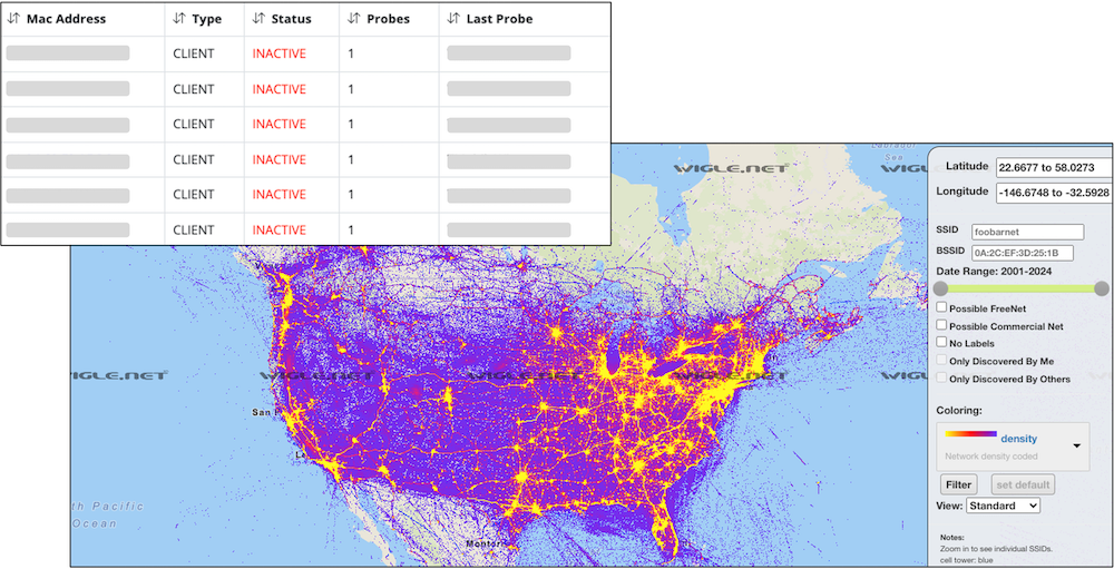 Even in cases where smartphones utilized Private WiFi for MAC address rotation, it was possible to extract access point names, or ESSID values, from client probe requests. This could allow unique names to be searched on sites such as WiGLE to identify known locations and presumably the owners home address.