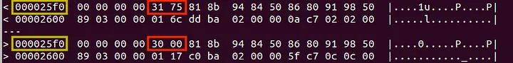 Therefore, we can identify the money offset by finding the location at which 30 00 is stored in file 1 and 31 75 is stored in file 2.