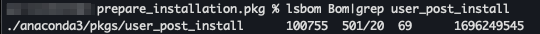 This vulnerability is fixed in Anaconda3 2024.06-1. The user_post_install.pkg is no longer included in the installation package, as \demonstrated below:
