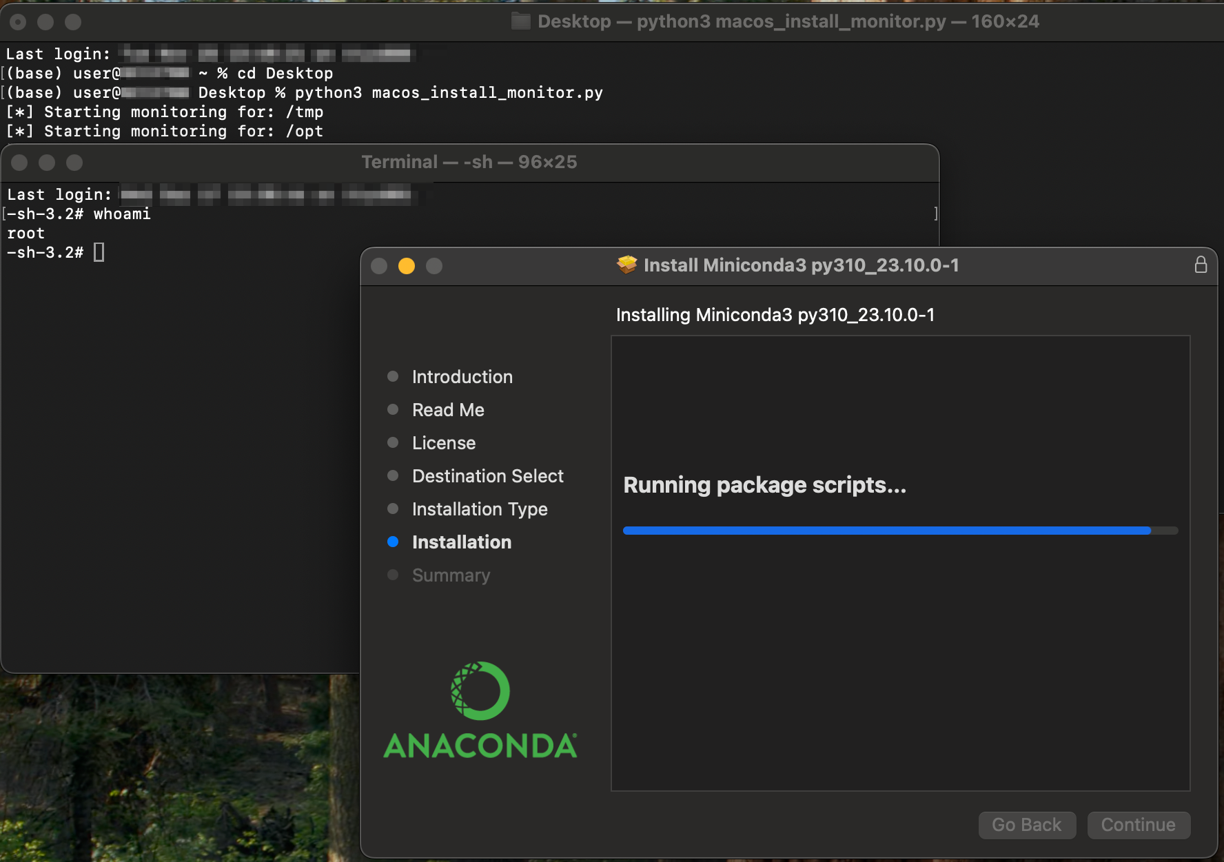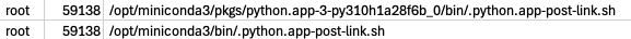 Using our modified file monitor, two post-link files, packaged as part of miniconda3/pkgs/python.app-3-py310h1a28f6b_0.conda and unpackaged during installation by prepare_installation.pkg, were susceptible to injection: