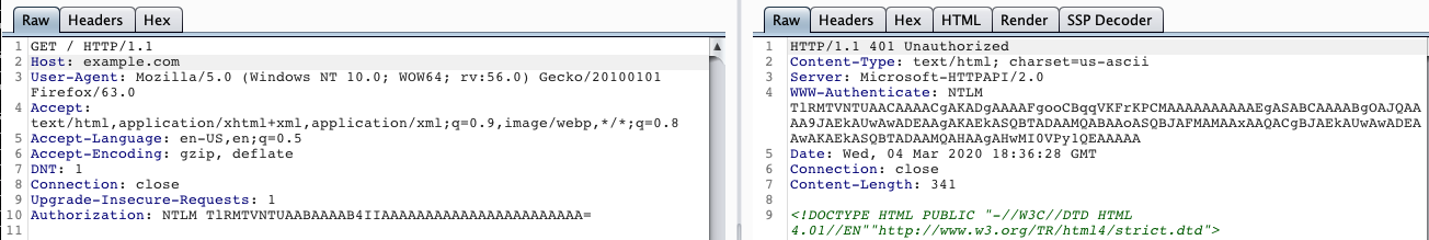 Once a target is identified as using NTLM authentication, we can initiate a connection and send anonymous (null) credentials, which will prompt the server to respond with an NTLM Type 2 challenge response.