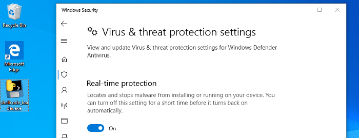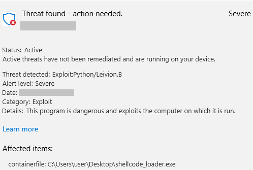 Unfortunately, when downloading the newly compiled shellcode_loader.exe onto the target system, I didnt get very far before receiving the following alert: